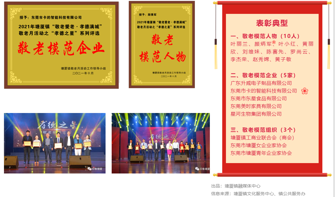 卡的科技荣获2021年塘厦镇 “敬老模范企业”称号,卡的科技总经理颜秉军荣获2021年塘厦镇“敬老模范人物”荣誉称号。塘厦镇委领导为荣誉获得者颁奖并表彰本次模范企业和模范人物大力弘扬孝老、敬老传统美德,在精神文明和公民道德建设中起到的示范引领作用。