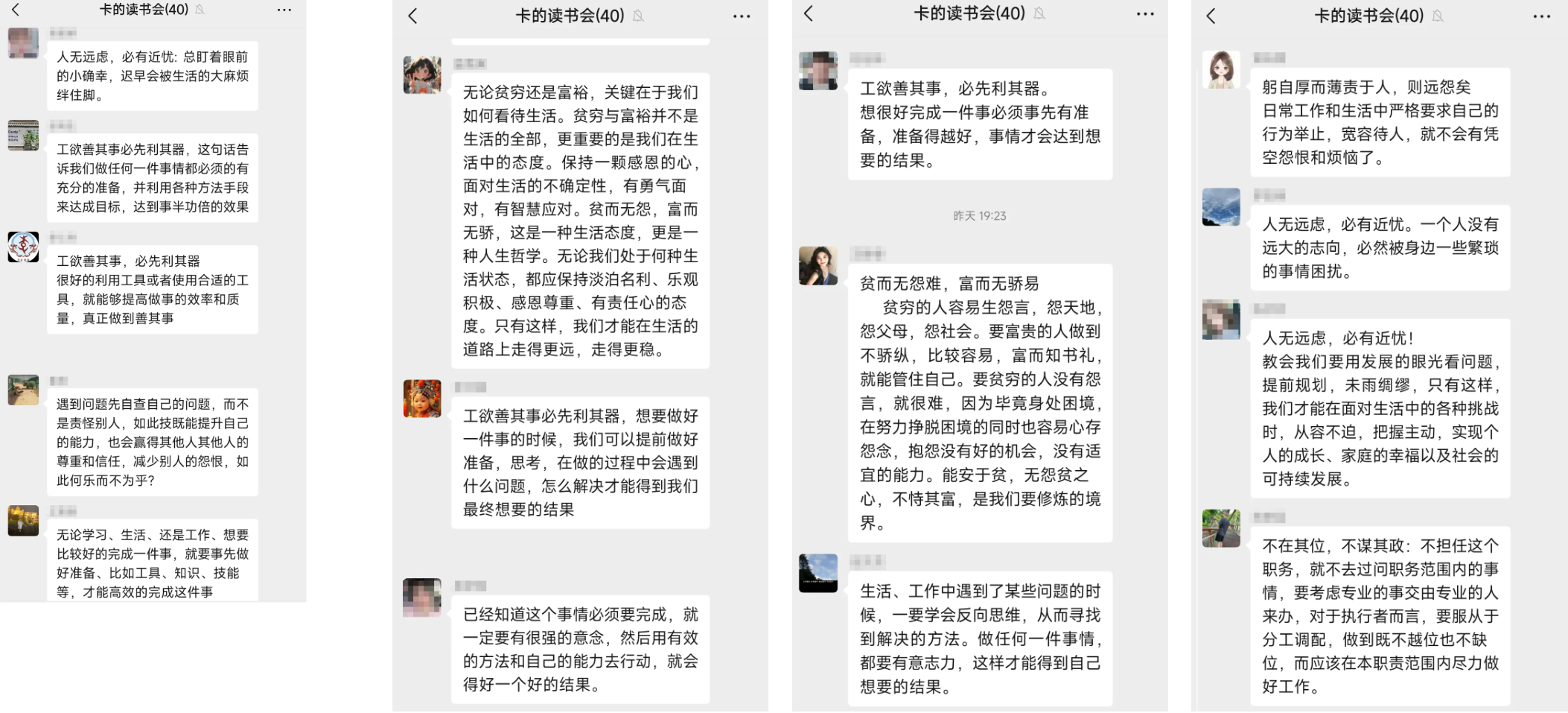 本期读书会以《论语精选》为主线,聚焦《论语》中“不在其位,不谋其政”“古之学者为己,今之学者为人”,“人无远虑,必有近忧”等经典名句。主讲人颜老师以日常工作和生活场景为切入点,解读古人智慧对当下工作和生活的启示。